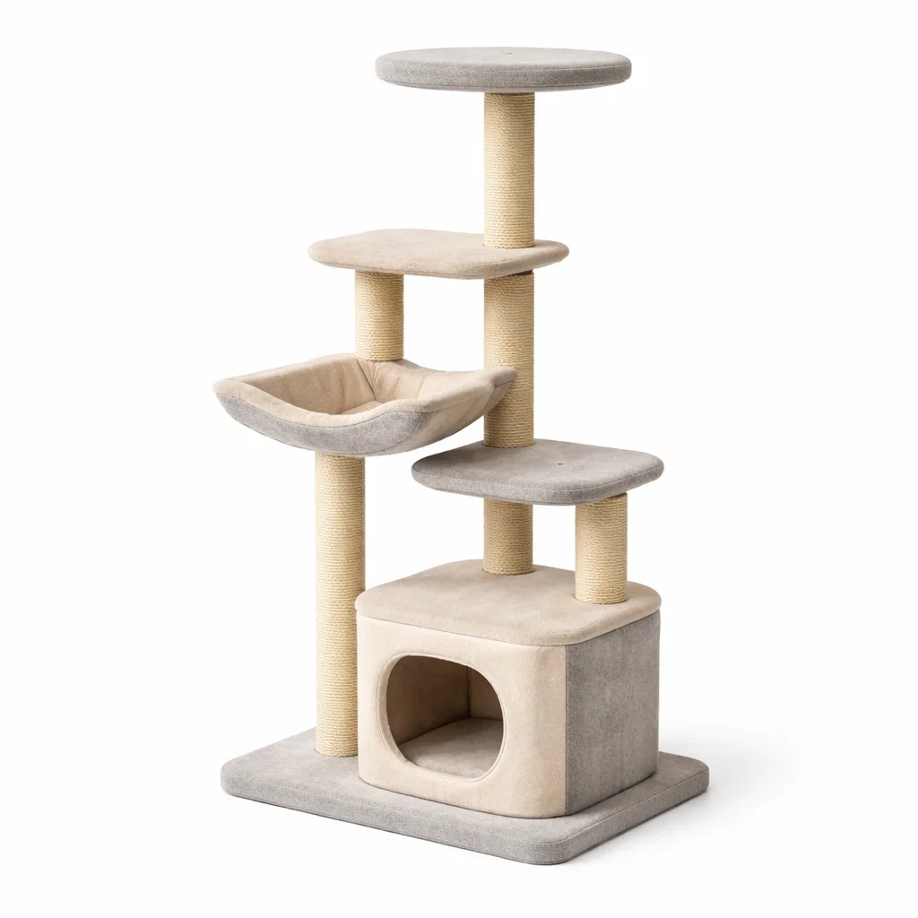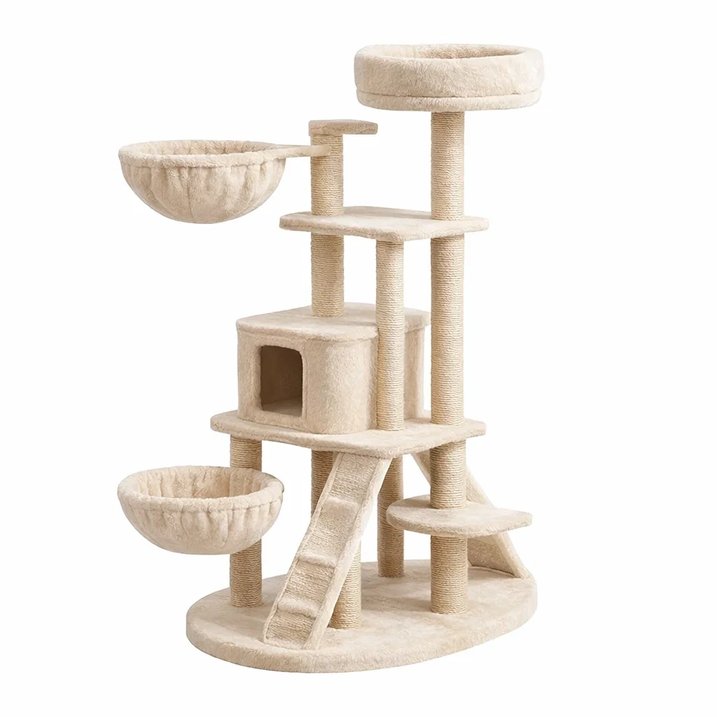 Tiragraffi per gatti in tessuto poliestere e sisal beige con cuccia e piattaforme