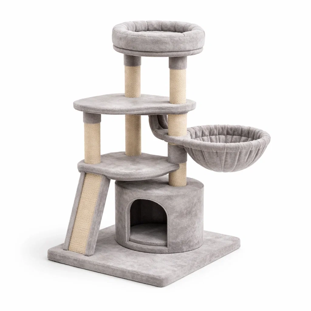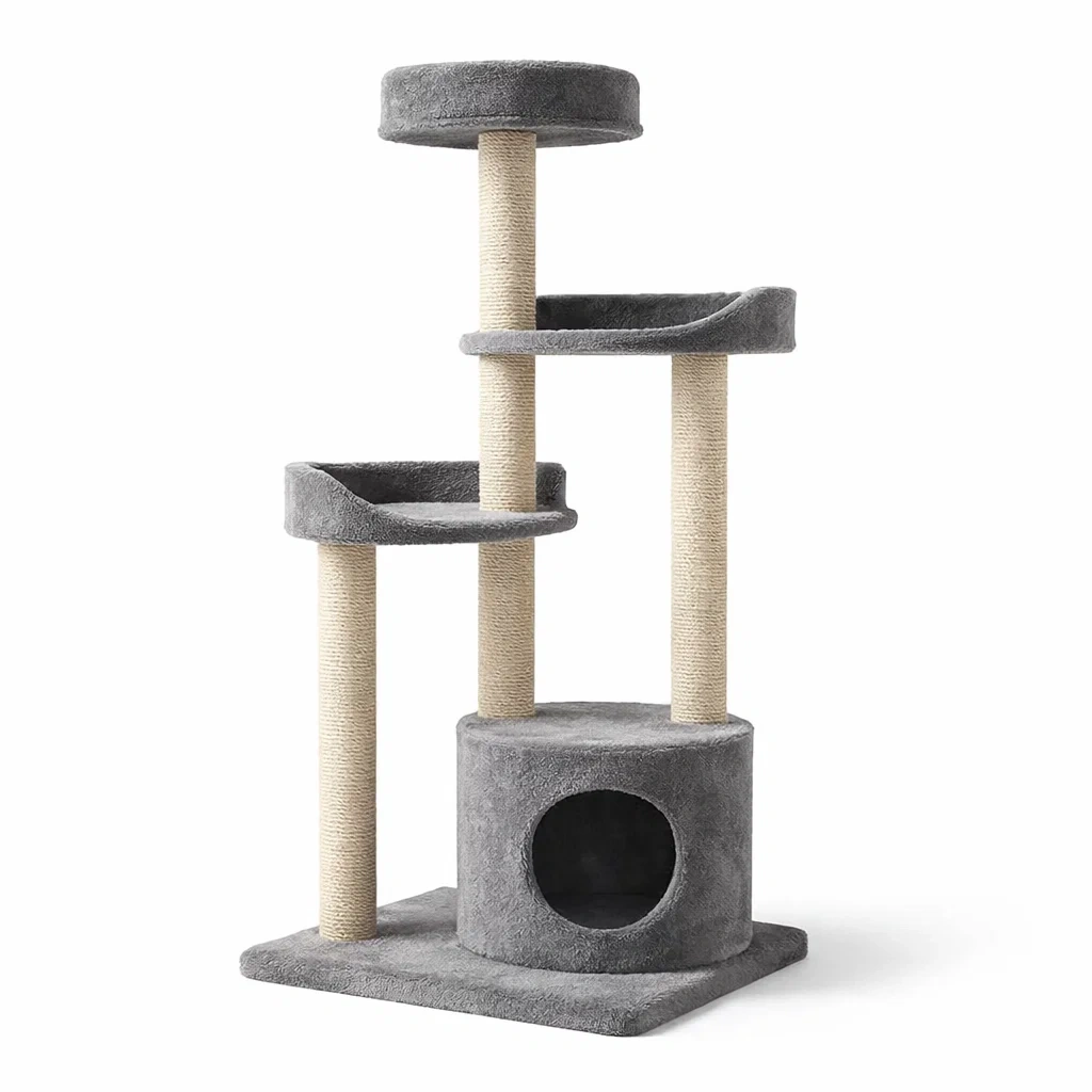 Tiragraffi per gatti con piattaforme e cuccia in tessuto e sisal beige e grigio