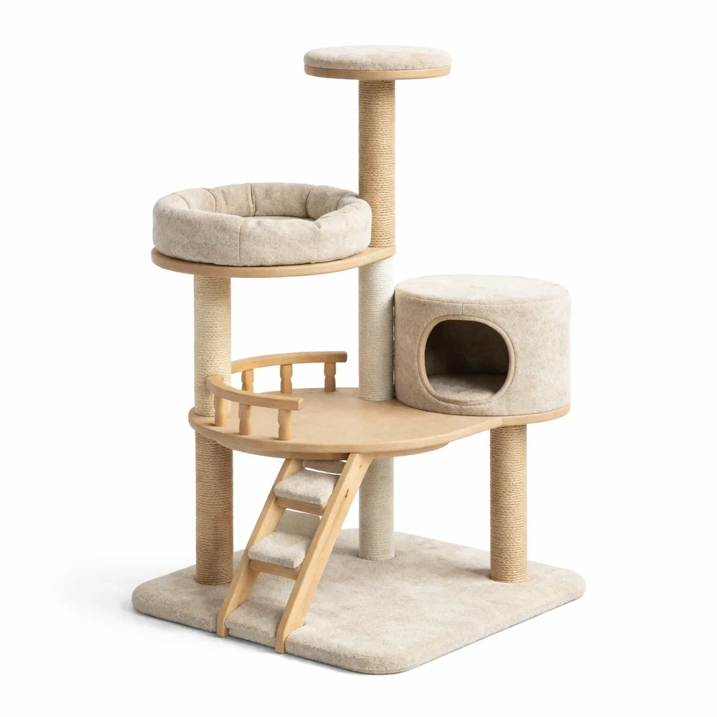 Tiragraffi in legno chiaro con piattaforme circolari e cuscini in cotone