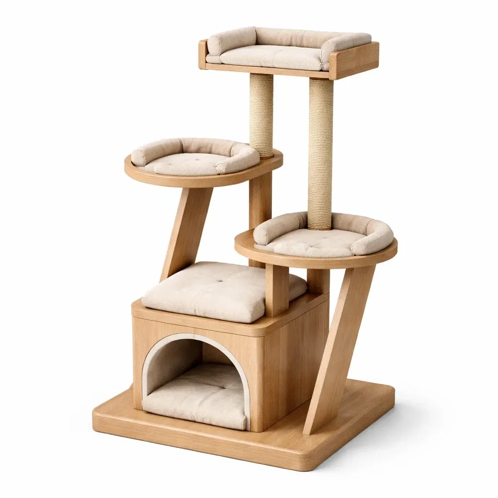 Tiragraffi in legno chiaro con piattaforme circolari e cuscini in cotone