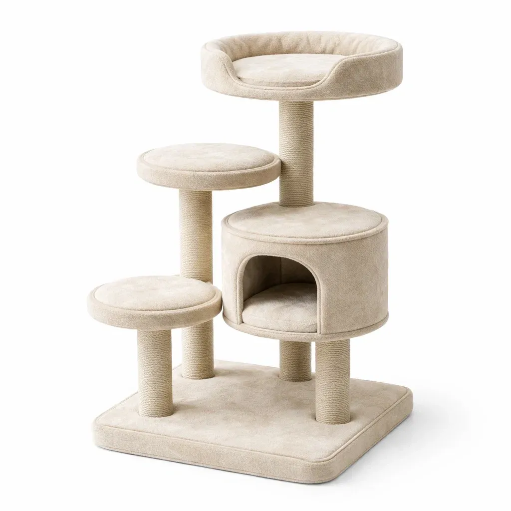 Questo albero tiragraffi è realizzato in poliestere Beige e sisal, ideale per i gatti. Include piattaforme imbottite e una casetta per il riposo. Le colonne ricoperte di sisal sono perfette per graffiare. Dimensioni complessive: 82 cm di altezza, 49 cm di larghezza, 49 cm di profondità. Supporta gatti fino a 10 kg.